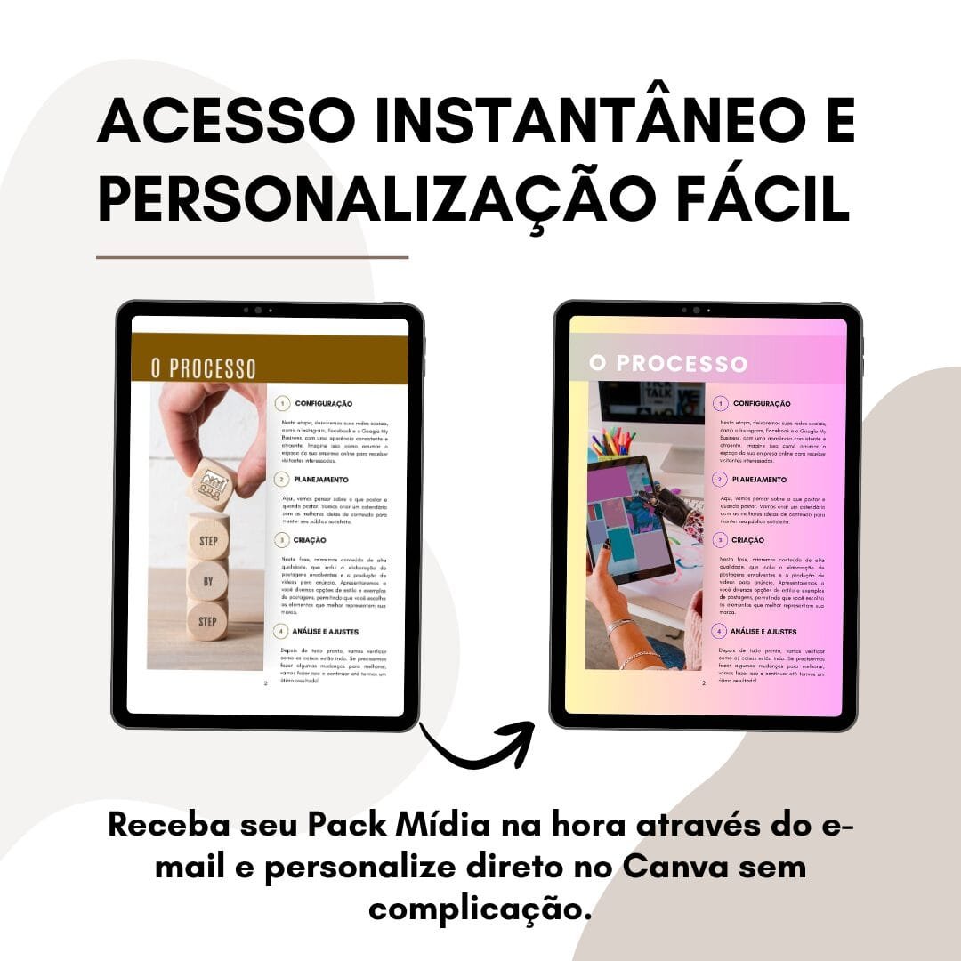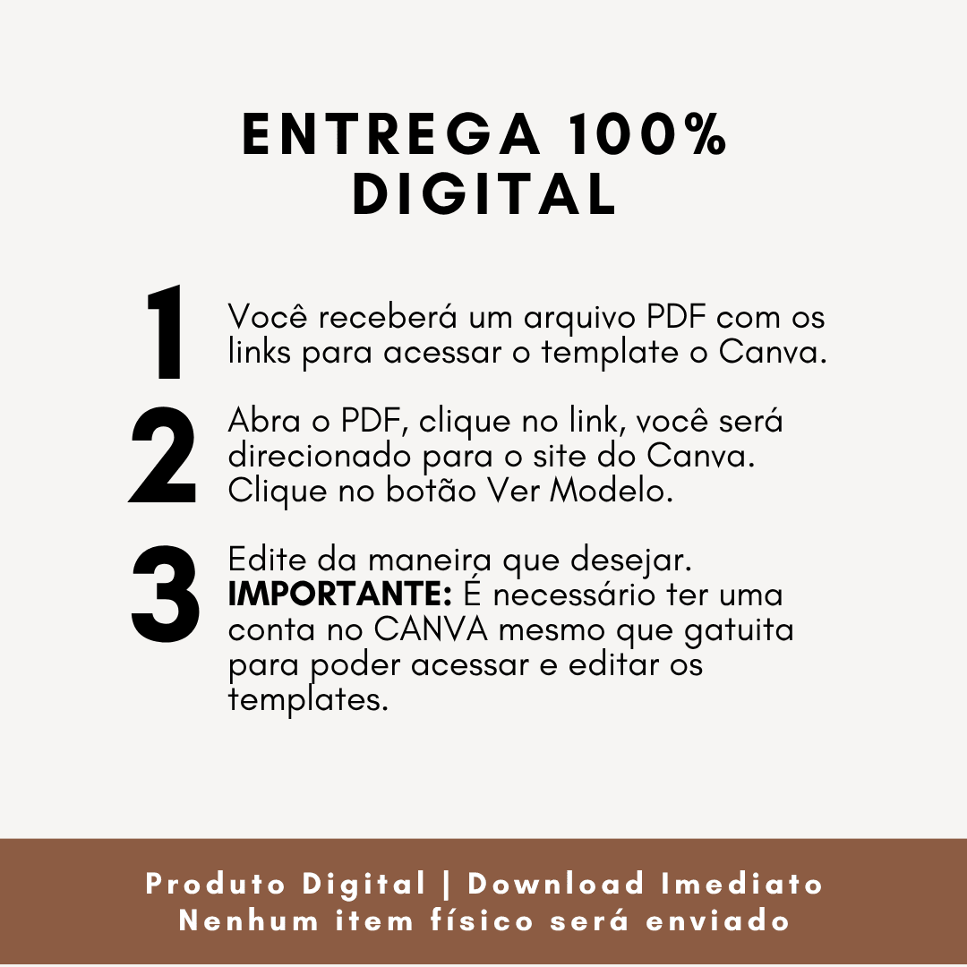 Todos os arquivos são acessados por link direto para o Canva, onde podem ser editados facilmente, com alteração de cores, textos e design para refletir sua marca. O envio é imediato, liberando o acesso assim que a compra é confirmada, o que permite que você comece a usar em minutos, sem complicações.