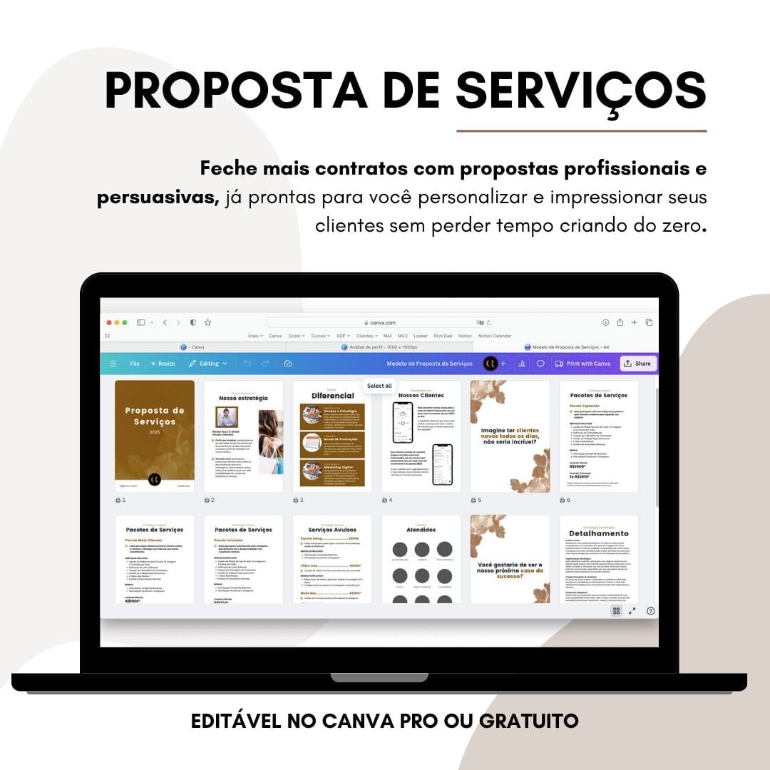 Este pack digital oferece um conjunto completo de templates prontos para edição no Canva Gratuito ou Pro, focados em facilitar sua apresentação para clientes e otimizar o fechamento de projetos.